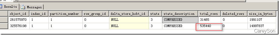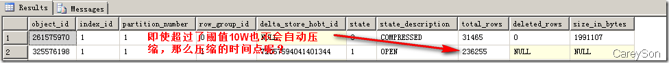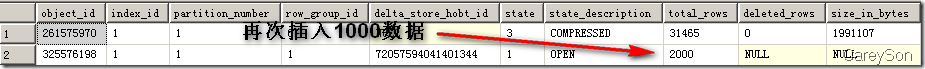 上述列存儲的兩部分我們可以通過2014新引入的DMV進(jìn)行觀測,如圖3所示。在圖3中,我們隊(duì)目前已經(jīng)存在31465行的聚集列索引插入了1000行新的數(shù)據(jù),則SQL Server認(rèn)為這部分?jǐn)?shù)據(jù)不滿10W行,因此以Deltastore的方式存在。