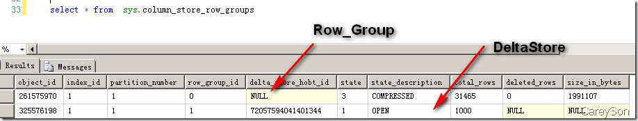 我們注意到其中有一部分不夠分組的,那么就直接讓這部分?jǐn)?shù)據(jù)以傳統(tǒng)行存儲的形式老實(shí)呆著吧,這就是所謂的Deltastore,等數(shù)據(jù)增長到可以分組時(shí)再進(jìn)行分組,目前SQL Server 2014認(rèn)為10W以下的數(shù)據(jù)都不夠分組。