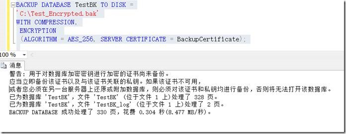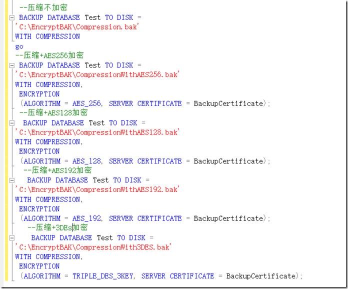 BACKUP DATABASE TestBK TO DISK ='C:\Test_Encrypted.bak'WITH COMPRESSION, ENCRYPTION (ALGORITHM = AES_256, SERVER CERTIFICATE = BackupCertificate);
