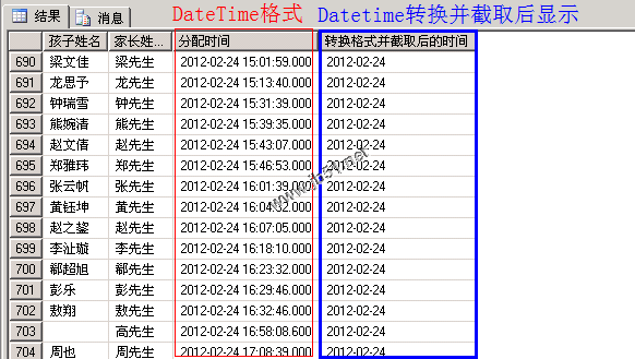 select sr_child as '孩子姓名', sr_parents as '家長姓名' ,ss_updatetime as '分配時間', left(ss_updatetime,CHARINDEX(' ',ss_updatetime)-1),SUBSTRING(CONVERT(CHAR(19), ss_updatetime, 120),1,10)as '轉(zhuǎn)換格式并截取后的時間'from dbo.tb_sell_resources,dbo.tb_sell_selldetails where sr_id = ss_rsid and ss_qdstate > 1 order by ss_updatetime