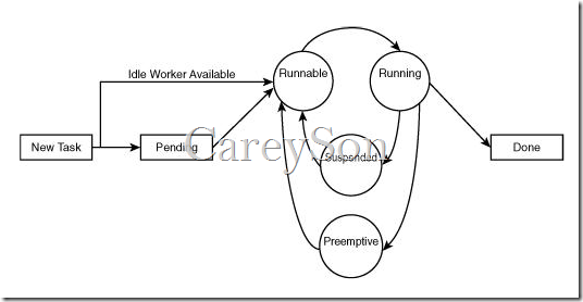 Worker實際上會對應(yīng)Windows上的一個線程,并與某個特定Scheduler綁定,每一個Worker只要開始執(zhí)行Task,除非Task完成,否則Worker永遠不會放棄這個Task,如果一個Task在運行過程由于鎖、IO等陷入等待,那么實際上Worker就會陷入等待。