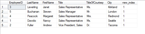 (select EmployeeID,LastName,FirstName,Title,TitleOfCourtesy,City,ROW_NUMBER() over(partition by City order by EmployeeID) as new_index
