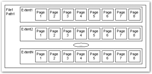 如圖2所示,文件是由區(qū)組成的,而區(qū)由八個物理上連續(xù)的頁組成,由于區(qū)的大小為64K,所以每當增加一個區(qū)文件就增加64K。
