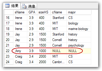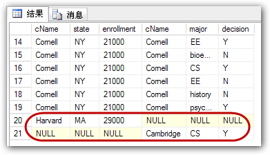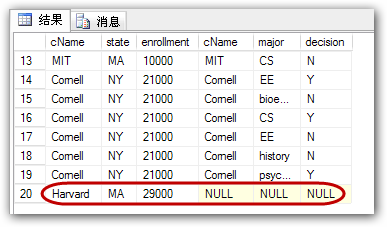 由于左聯(lián)接(left outer join)產(chǎn)生表College的完全集,而Apply表中匹配的則有值,而不匹配的則以NULL值取代,所以我們知道Apply表中沒有學(xué)生申請(qǐng)Harvard。