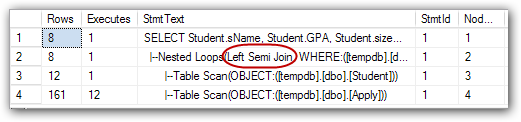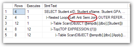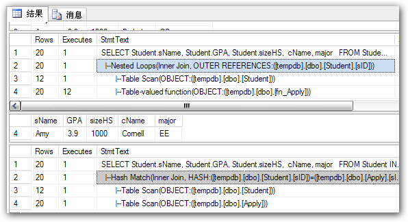 如圖8所示:Cross apply首先執(zhí)行TVF(table-valued functions),然后對(duì)表Studnet進(jìn)行全表掃描,接著通過(guò)遍歷sID查找匹配值。