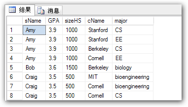 如上圖1所示,我們把Apply表包含的學(xué)校信息查詢出來(lái)了,由于Harvard并沒有被查詢出來(lái),所以我們知道暫時(shí)還沒有學(xué)生申請(qǐng)Harvard。
