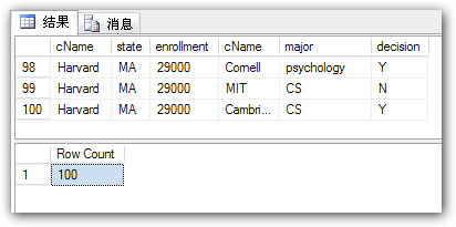現(xiàn)在我們對(duì)College和Apply表進(jìn)行交叉聯(lián)接,而且生成數(shù)據(jù)行為College和Apply表行數(shù)的笛卡爾積即5 * 20 = 100。