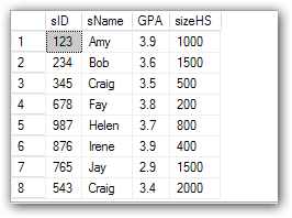 SELECT Student.sID, Student.sName, Student.GPA, Student.sizeHS