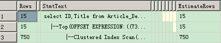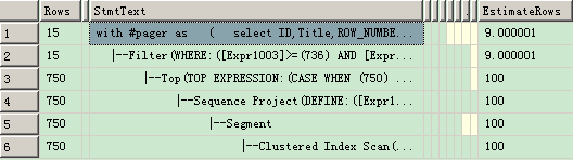 執(zhí)行計(jì)劃只有3行,并且占用資源 100% 的IO 操作 ,EstimateRows = 100 和 Rows = 750 是和 ROW_NUMBER() 完全一樣的,但是其他的一些操作卻少了很多,也就是說,并沒有全表掃描,并降低了CPU 的消耗。