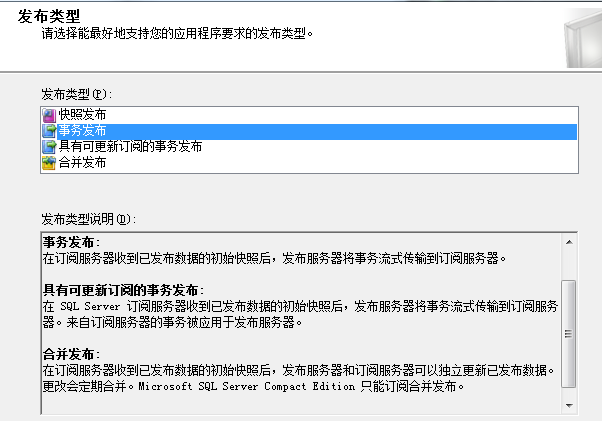數(shù)據(jù)庫(kù)發(fā)布類型有三種:快照發(fā)布,事務(wù)性發(fā)布,具有可更新訂閱和事務(wù)性發(fā)布,合并發(fā)布