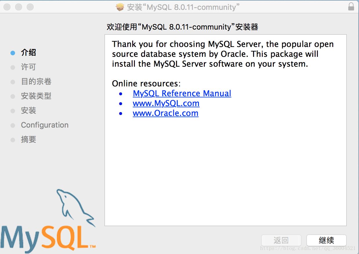 雙擊打開(kāi)mysql-8.0.11-macos10.13-x86_64.dmg,然后雙擊mysql-8.0.11-macos10.13-x86_64.pkg