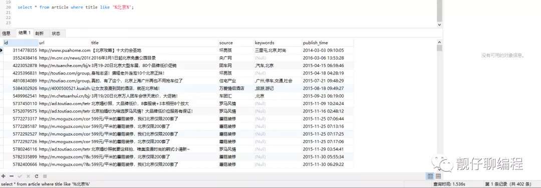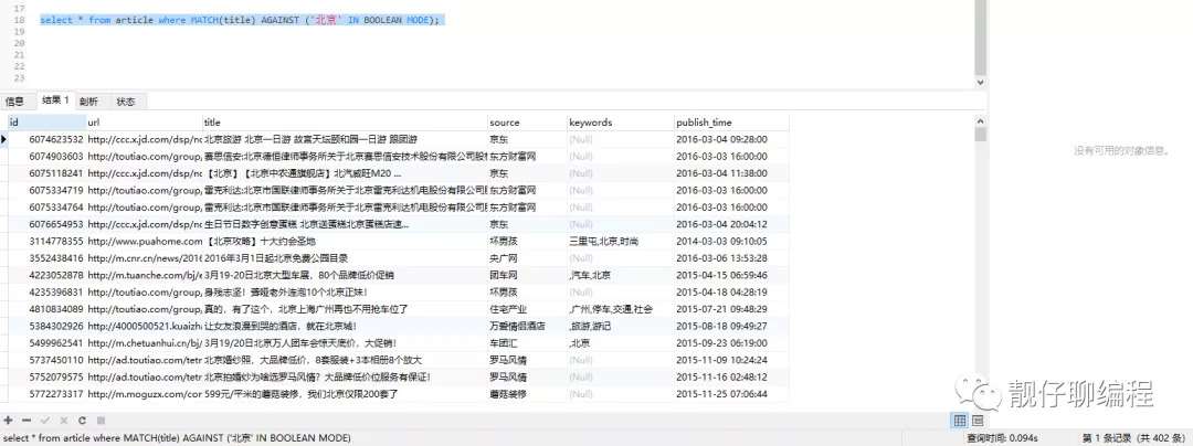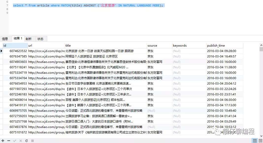select * from article where MATCH(title) AGAINST ('北京旅游');