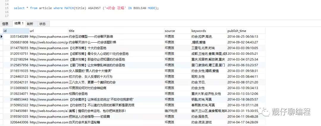 select * from article where MATCH(title) AGAINST ('+約會(huì) 攻略' IN BOOLEAN MODE);