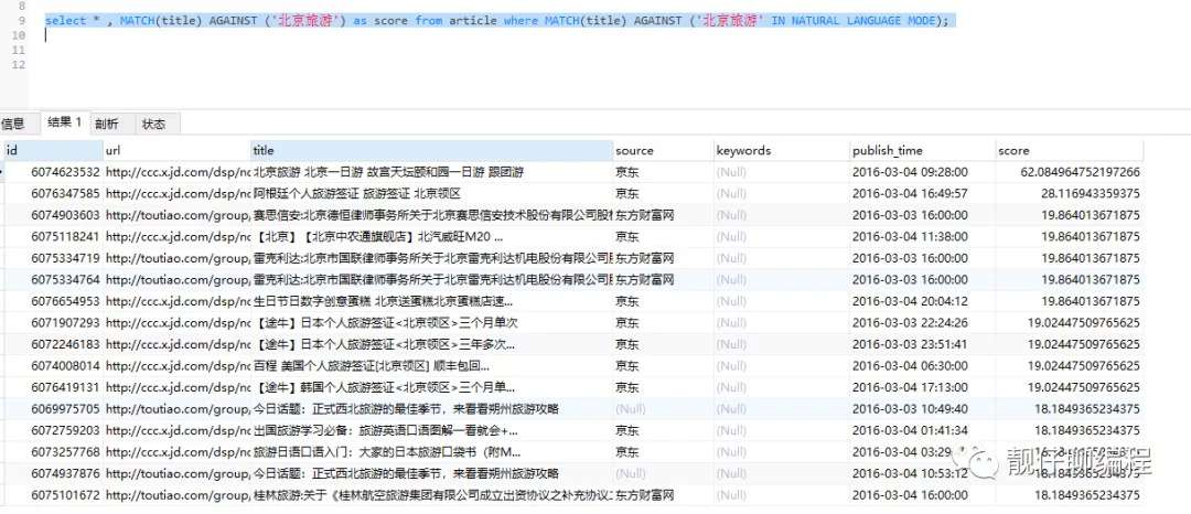 select * , MATCH(title) AGAINST ('北京旅游') as score from article where MATCH(title) AGAINST ('北京旅游' IN NATURAL LANGUAGE MODE);