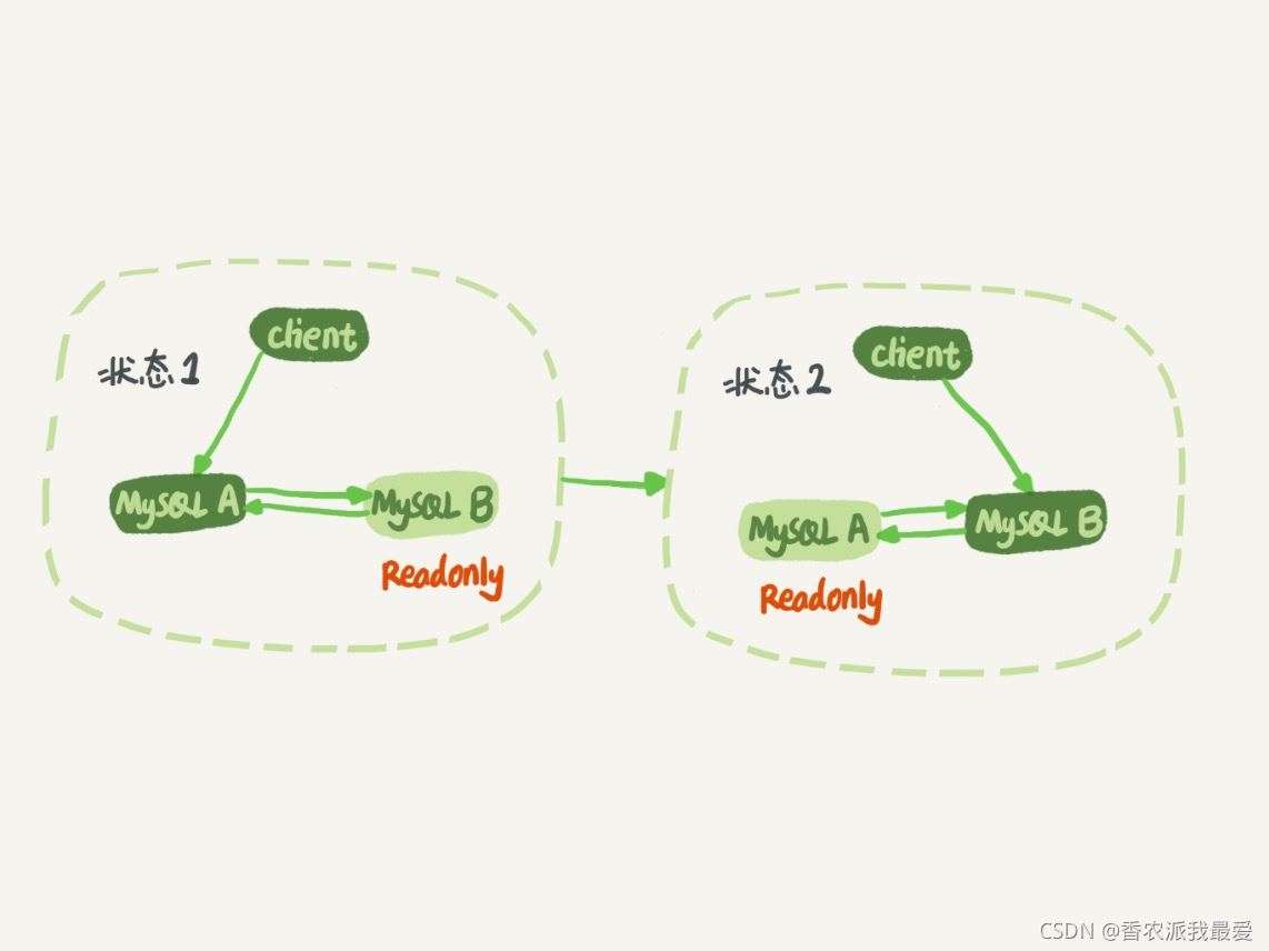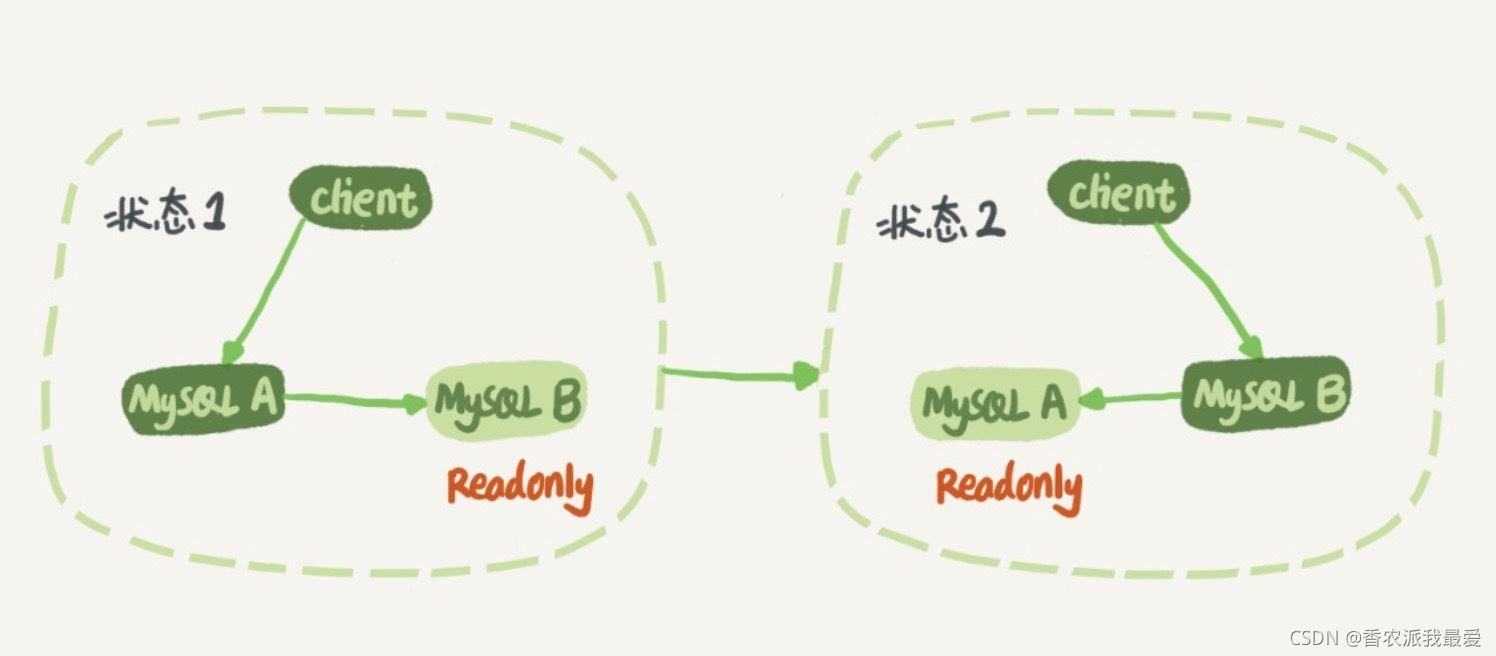 當(dāng)需要切換的時(shí)候,就切成狀態(tài) 2。這時(shí)候客戶端讀寫訪問的都是節(jié)點(diǎn) B,而節(jié)點(diǎn) A 是 B 的備庫。