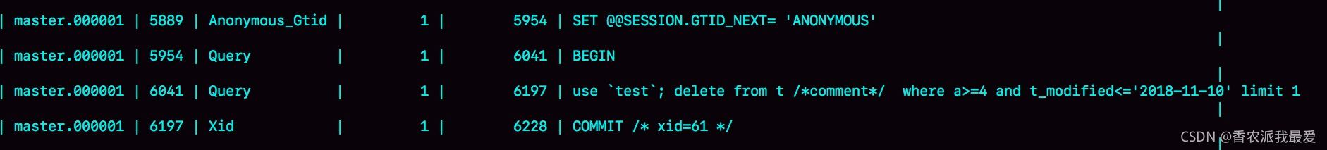 - 第一行 SET @@SESSION.GTID_NEXT='ANONYMOUS'你可以先忽略,后面文章我們會在介紹主備切換的時(shí)候再提到;