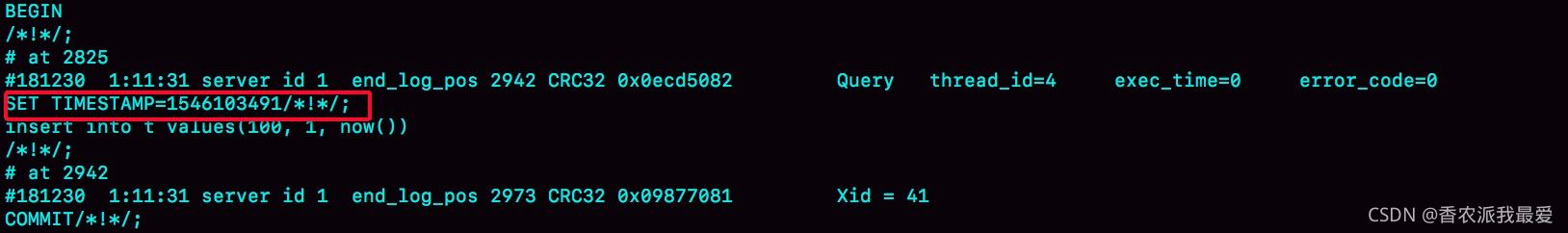 原來 binlog 在記錄 event 的時(shí)候,多記了一條命令:SET TIMESTAMP=1546103491。它用 SET TIMESTAMP 命令約定了接下來的 now() 函數(shù)的返回時(shí)間。通過這條 SET TIMESTAMP 命令,MySQL 就確保了主備數(shù)據(jù)的一致性。