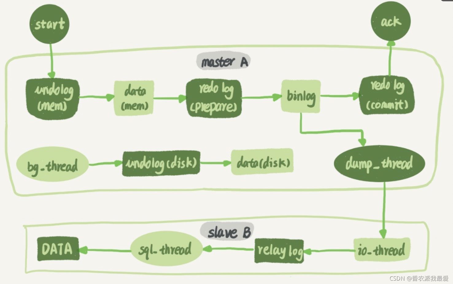 - 在備庫 B 上執(zhí)行 start slave 命令,這時(shí)候備庫會啟動兩個線程,就是圖中的 io_thread 和 sql_thread。其中 io_thread 負(fù)責(zé)與主庫建立連接。