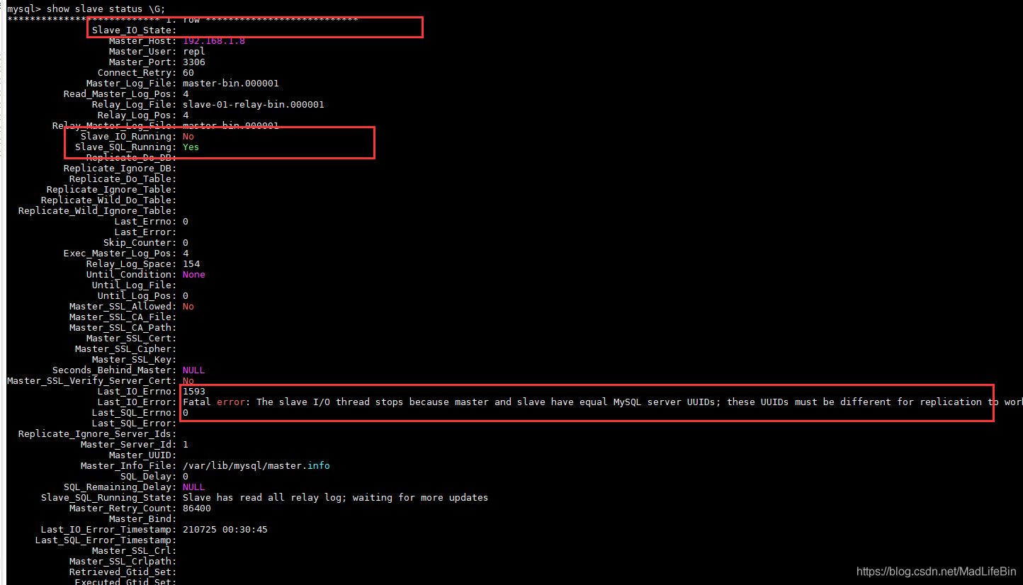 若查看主從狀態(tài)提示The slave I/O thread stops because master and slave have equal MySQL server UUIDs; these UUIDs must be different for replication to work.請(qǐng)參考常見(jiàn)問(wèn)題