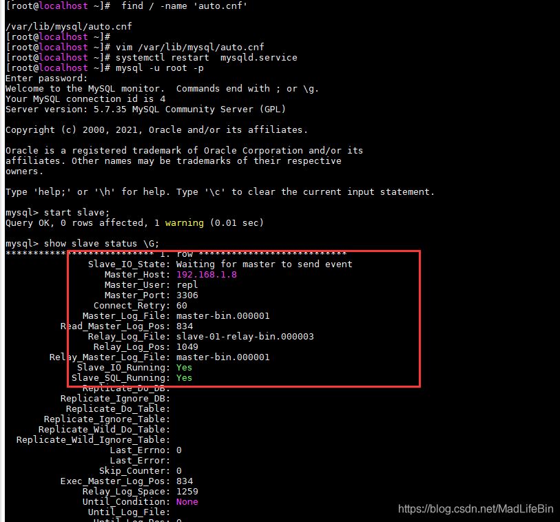 找到MySQL的UUID,修改一個(gè)字符,重啟服務(wù),然后登陸MySQL控制臺(tái),開(kāi)啟主從