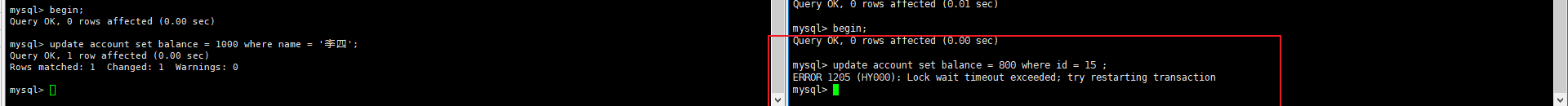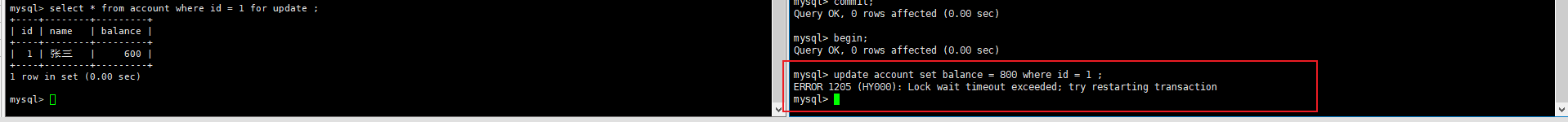 4.3 在客戶端A未提交的時(shí)候,客戶端B執(zhí)行update account set balance = 800 where id = 1 ;會(huì)被阻塞至客戶端A提交或者超時(shí);