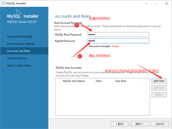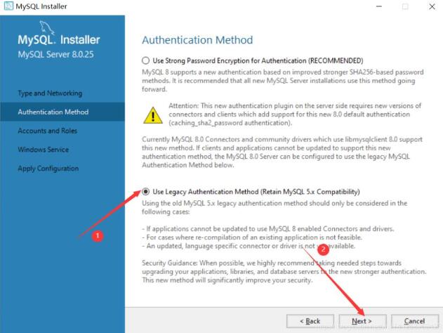 這里是選擇密碼的一個(gè)設(shè)置方式,如果選擇第一個(gè)那么就會(huì)使用MySQL8.X的一個(gè)密碼設(shè)方式進(jìn)行設(shè)置密碼,選擇第二個(gè)就可以使用MySQL5.X的方式設(shè)置密碼,我們選擇第二個(gè)。