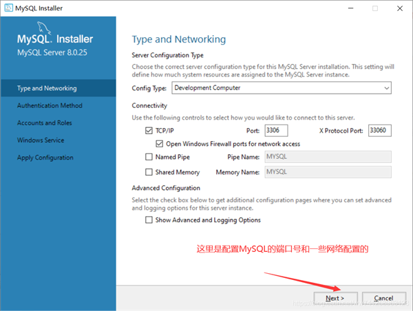 這里是配置MySQL的端口號(hào)和網(wǎng)絡(luò)配置的,我們直接選擇默認(rèn)的就好了,點(diǎn)擊Next,如有需要請(qǐng)參照:這里