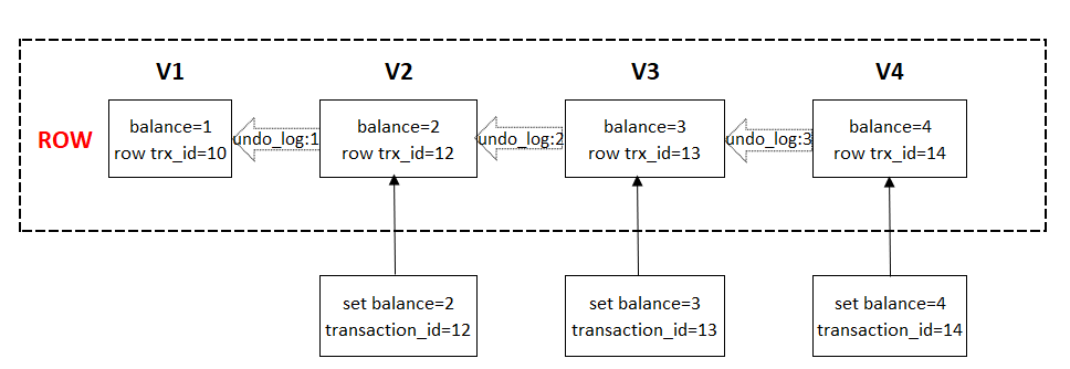 - 通過undo_log可以從V4撤回到V1,找到V1版本的balance=1,即undo_log回滾版本。