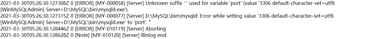 Unknown suffix ' ' used for variable ‘port' (value ‘3306 default-character-set=utf8 [WinMySQLAdmin] Server=D:\MySQL\bin\mysqld.exe').