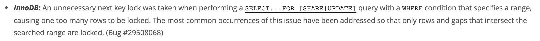 = 查詢(xún)時(shí),8.0.17 會(huì)鎖住下一個(gè) next-key 的前開(kāi)后閉區(qū)間,而 8.0.18 及以后版本,修復(fù)了這個(gè) bug。