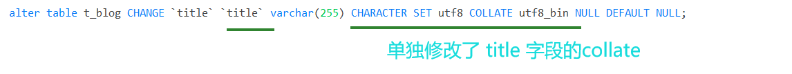 alter table t_blog CHANGE `title` `title` varchar(255) CHARACTER SET utf8 COLLATE utf8_bin NULL DEFAULT NULL;