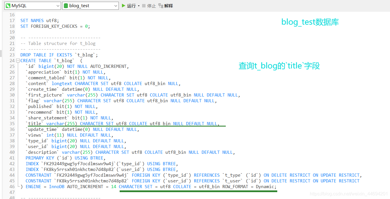 單獨(dú)指定所需字段(比如,在此處 我所需要區(qū)分大小寫的字段為表 ‘t_blog' 中的 ‘title' 字段)為 ‘utf8' 編碼格式,COLLATE 為“utf8_bin”;