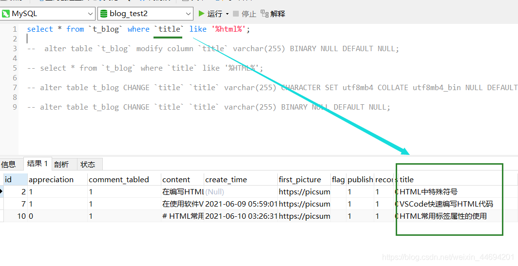 select * from t_blog where BINARY title like ‘%html%';