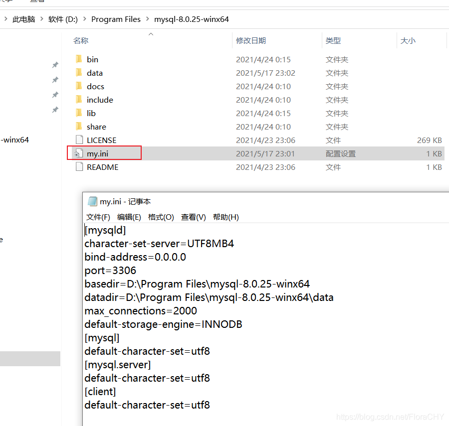 在解壓后的mysql目錄下面新建一個(gè)data的空文件夾,再在D:\Program Files\mysql-8.0.25-winx64下新建一個(gè)my.ini的配置文件。在該文件中寫入以下代碼: