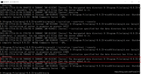 這里需要注意的一點(diǎn),如果data文件不為空,則會(huì)報(bào)錯(cuò):The designated data directory D:\Program Files\mysql-8.0.25-winx64\data\ is unusable. You can remove all files that the server added to it.