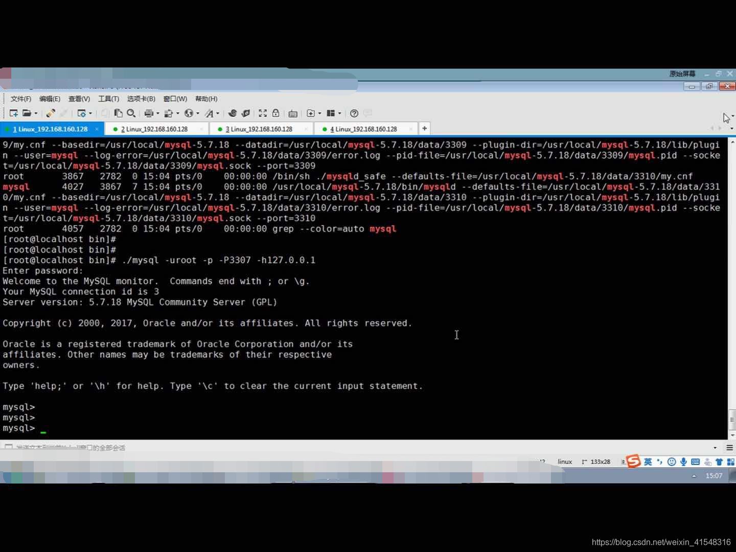 ./mysql -uroot -p -P3307 -h127.0.0.1 #注意在/usr/loacl/mysql-5.7.18/bin下執(zhí)行