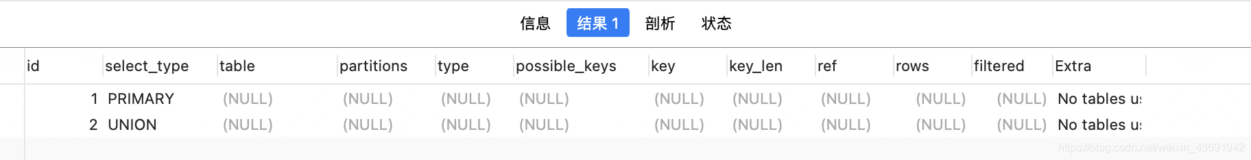 當(dāng)有 union 時(shí),UNION RESULT 的 table 列的值為union1,2>,1和2表示參與 union 的 select 行id。