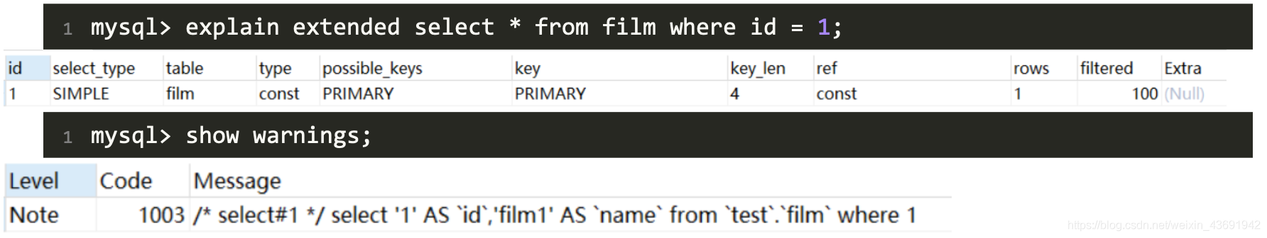 mysql> explain extended select * from (select * from film where id = 1) tmp;