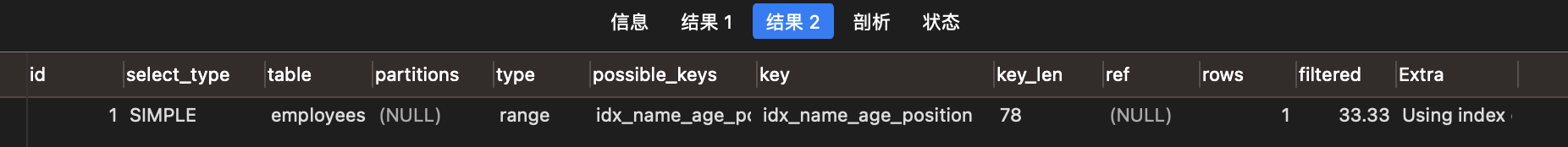 EXPLAIN SELECT name,age FROM employees WHERE name= 'LiLei' AND age = 23 AND position ='manager';