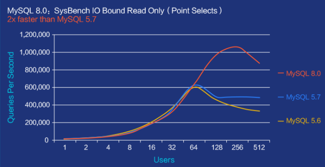 性能提升級。官方表示MySQL 8.0 的速度要比 MySQL 5.7 快 2 倍。MySQL 8.0 在讀/寫工作負載、IO 密集型工作負載、以及高競爭工作負載時相比MySQL5.7有更好的性能