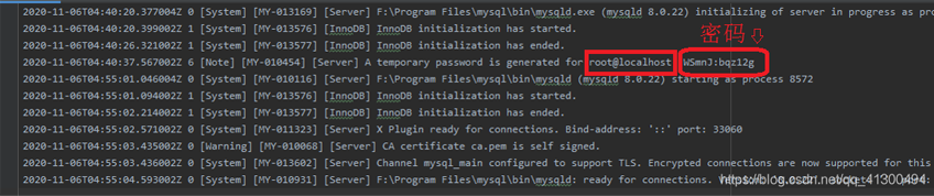 找到 **A temporary password is generated for root@localhost:**后面的那串?dāng)?shù)字就是臨時(shí)密碼,這就是我的臨時(shí)密碼:WSmnJ:bqz12g