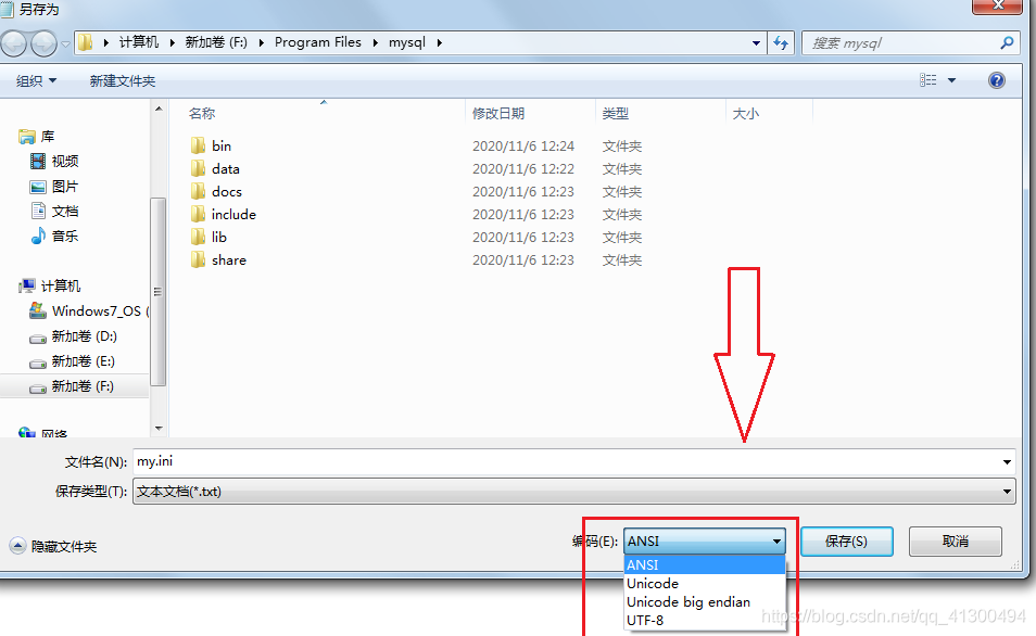 把my.ini文件用記事本打開,然后左上角文件另存為,編碼哪里選擇ANSI格式即可。