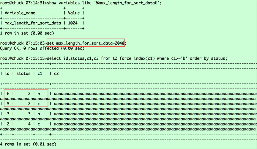 (c1,id)===(b,6),(b,3),(5,c),(c,2),對應(yīng)的status值分別為2 3 2 4。從表中撈取數(shù)據(jù)并按status排序,則相對位置變?yōu)?6,2,b),(5,2,c),(3,3,c),(2,4,c),這就是第二條語句查詢返回的結(jié)果,那么為什么第一條查詢語句(6,2,b),(5,2,c)是調(diào)換順序的呢?這里要看我之前提到的a.常規(guī)排序和b.優(yōu)化排序中標紅的部分,就可以明白原因了。由于第一條查詢返回的列的字節(jié)數(shù)超過了max_length_for_sort_data,導(dǎo)致排序采用的是常規(guī)排序,而在這種情況下MYSQL將rowid排序,將隨機IO轉(zhuǎn)為順序IO,所以返回的是5在前,6在后;而第二條查詢采用的是優(yōu)化排序,沒有第二次撈取數(shù)據(jù)的過程,保持了排序后記錄的相對位置。對于第一條語句,若想采用優(yōu)化排序,我們將max_length_for_sort_data設(shè)置調(diào)大即可,比如2048。