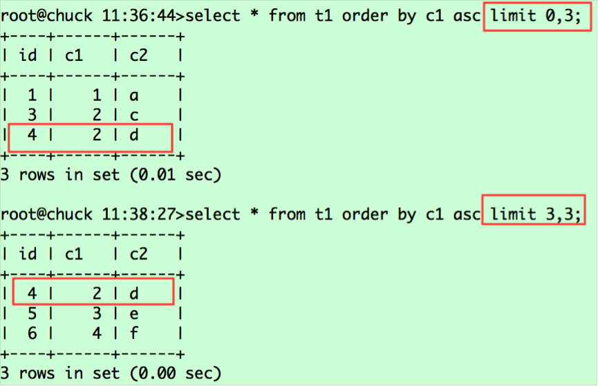 我們可以看到 id為4的這條記錄居然同時出現(xiàn)在兩次查詢中,這明顯是不符合預(yù)期的,而且在5.5版本中沒有這個問題。產(chǎn)生這個現(xiàn)象的原因就是5.6針對limit M,N的語句采用了優(yōu)先隊列,而優(yōu)先隊列采用堆實現(xiàn),比如上述的例子order by c1 asc limit 0,3 需要采用大小為3的大頂堆;limit 3,3需要采用大小為6的大頂堆。由于c1為2的記錄有3條,而堆排序是非穩(wěn)定的(對于相同的key值,無法保證排序后與排序前的位置一致),所以導(dǎo)致分頁重復(fù)的現(xiàn)象。為了避免這個問題,我們可以在排序中加上唯一值,比如主鍵id,這樣由于id是唯一的,確保參與排序的key值不相同。將SQL寫成如下: