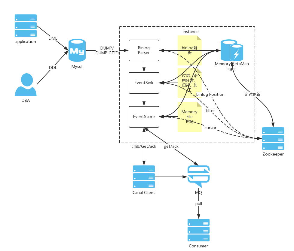 Connection獲取上一次解析成功的log position(如果是第一次啟動(dòng),則獲取初始指定的位置或者是當(dāng)前數(shù)據(jù)庫的binlog log position)Connection建立連接,向MySQL master發(fā)送BINLOG_DUMP請求MySQL開始推送binary Log接收到的binary Log通過BinlogParser進(jìn)行協(xié)議解析,補(bǔ)充一些特定信息。如補(bǔ)充字段名字、字段類型、主鍵信息、unsigned類型處理等將解析后的數(shù)據(jù)傳入到EventSink組件進(jìn)行數(shù)據(jù)存儲(chǔ)(這是一個(gè)阻塞操作,直到存儲(chǔ)成功)定時(shí)記錄binary Log位置,以便重啟后繼續(xù)進(jìn)行增量訂閱