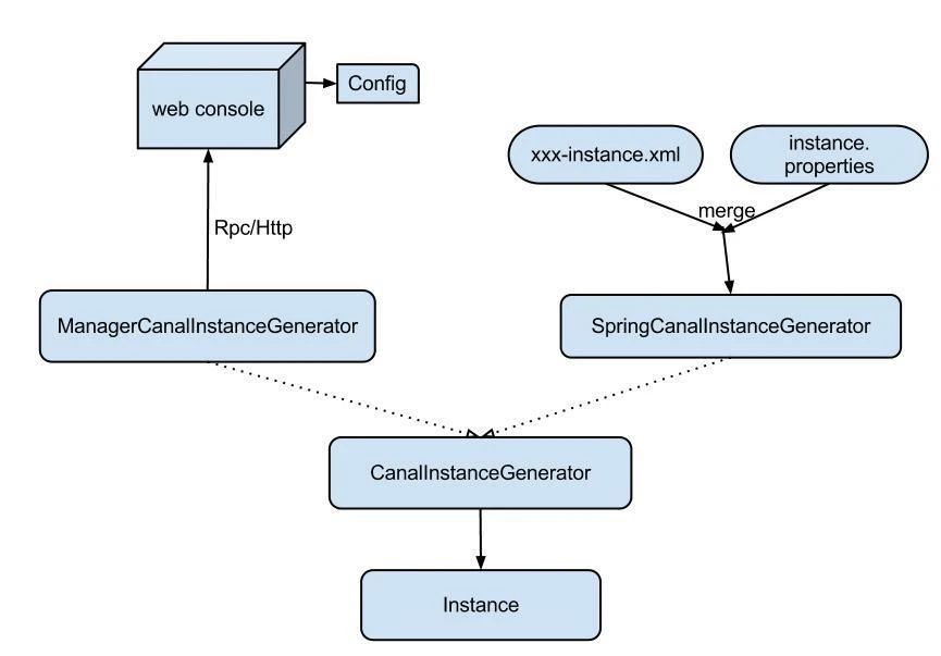 instance代表了一個(gè)實(shí)際運(yùn)行的數(shù)據(jù)隊(duì)列,包括了EventPaser、EventSink、EventStore等組件。抽象了CanalInstanceGenerator,主要是考慮配置的管理方式:
