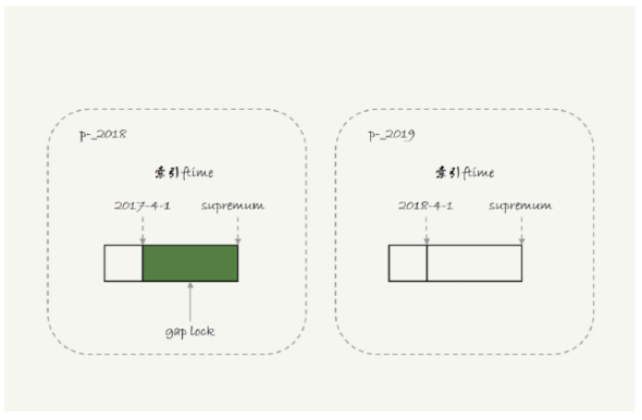 由于分區(qū)表的規(guī)則,sessionA只操作了p2018,sessionB要插入2018-2-1是可以的但要寫入2017-12-1要等待sessionA的間隙鎖。