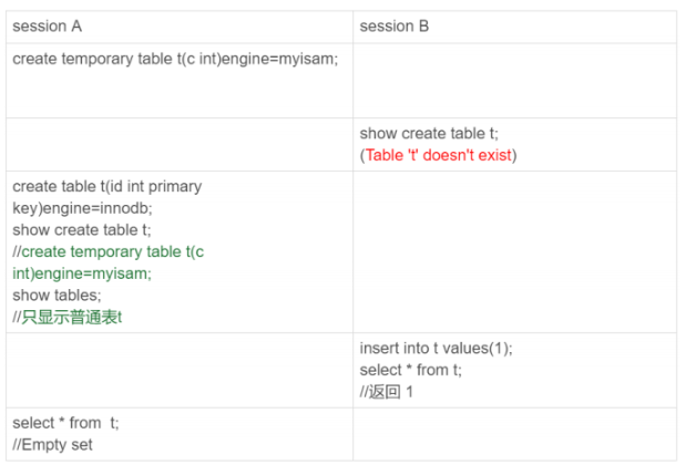 - 一個臨時表只能被創(chuàng)建它的session訪問,對其他線程不可見。所以,圖中session A創(chuàng)建的 臨時表t,對于session B就是不可見的。