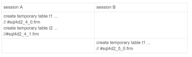 也就是說,session A和sessionB創(chuàng)建的兩個臨時表t1,它們的table_def_key不同,磁盤文件名 也不同,因此可以并存。